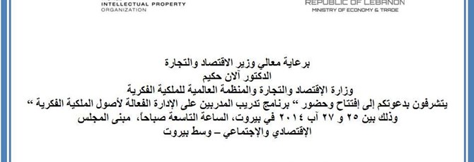 تنظم وزارة الإقتصاد والتجارة وبالتعاون مع المنظمة العالمية للملكية الفكرية برنامج متقدم لتدريب المدربين على الإدارة الفعالة لأصول الملكية الفكرية وذلك بين 25 و 27 آب 2014 في بيروت،...