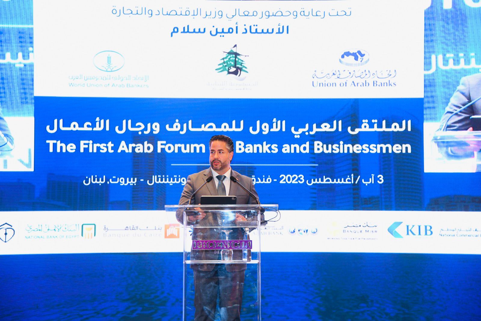 معالي الوزراء، سعادة النواب، الأمناء العامون، رؤساء المجالس واللجان، الحضور الكريم، يسعد صباحكم واهلاً وسهلاً بكم في بلدكم الحبيب لبنان في مدينتكم الغالية بيروت، اهلاً وسهلاً بكم جميعاً في بلد الأرز ولؤلؤة الشرق بلد الحرف وجامعة الشرق بلد الطب ومستشفى الشرق بلد الابجدية والفينيقية بلد الاربع فصول والاربعين نهر اهلاً بكم على ساحل العرب على المتوسط وقريباً جداً منصّة النفط والغاز في محيط البحر الابيض المتوسط، اهلاً بكم في وطن العرب والعروبة وطن المحبة والجمال والسلام اهلاً والف مرحباً بكم في وطننا الغالي لبنان. سادتي سيداتي شكراً لحضوركم معنا اليوم هذا المؤتمر الذي ينظّمه اتحاد المصارف العربية بالتعاون مع الاتحاد الدولي للمصرفيين العرب ووزارة الاقتصاد والتجارة تحت "عنوان الملتقى العربي الأول للمصارف ورجال الأعمال"،